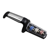 Konstrukcja ostrzałki kółkowej jest bardzo prosta. Składa się z uchwytu, dzięki któremu można wygodnie trzymać narzędzie, małego pojemnika na wodę oraz ceramicznych kółek do ostrzenia.